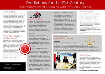 This poster addresses the ethical value of the above issues, highlighting the varied pro bono work already done with individuals and voluntary organizations, and student run initiatives, including those of the University of Central Lancashire, in the UK.
