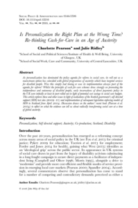 As personalisation has dominated the policy agenda for reform in social care, its roll out as a mainstream option has coincided with global programmes of austerity which have targeted services for disabled people. Was this simply bad timing or was its implementation always part of the agenda for reform? Whilst the principle of cash-for-care schemes drew strongly on promoting the independence and autonomy of disabled people, early incarnations of direct payments policy in the UK were initially at least in part rolled out in light of potential cost savings to social care budgets. This article explores these and other issues in light of evaluations of the Scottish Government’s self-directed support test sites (2009-2011) and implementation of subsequent legislation enforcing models of self-directed support in Scotland from April 2014. Discussion draws on the authors’ recent book (Pearson, Ridley and Hunter, 2014) to reflect on what the evidence can tell us about radically transforming social care at a time of global austerity.