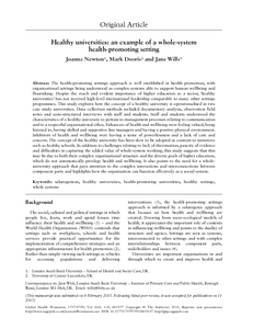 The health-promoting settings approach is well established in health promotion, with organisational settings being understood as complex systems able to support human wellbeing and flourishing. Despite the reach and evident importance of higher education as a sector, ‘healthy universities’ has not received high-level international leadership comparable to many other settings programmes. This study explores how the concept of a healthy university is operationalised in two case study universities. Data collection methods included documentary analysis, observation field notes and semi-structured interviews with staff and students. Staff and students understood the characteristics of a healthy university to pertain to management processes relating to communication and to a respectful organisational ethos. Enhancers of health and wellbeing were feeling valued, being listened to, having skilled and supportive line managers and having a positive physical environment.