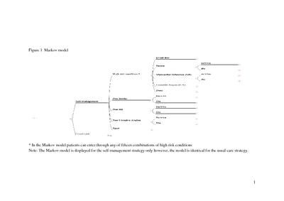 Design and methods: A Markov model-based economic evaluation was undertaken to estimate the long-term cost-effectiveness of self-management of blood pressure in a cohort of 70-year old ‘high risk’ patients, compared with usual care. The model used the results of the TASMIN-SR trial. A cost-utility analysis was undertaken from a UK health and social care perspective, taking into account lifetime costs of treatment, cardiovascular events and quality adjusted life years (QALYs). A sub-group analysis ran the model separately for men and women. Deterministic sensitivity analyses examined the effect of different time horizons and reduced effectiveness of self-management.