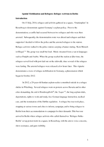 This article examines the ways in which refugee activists attained visibility within the public sphere while they contested, resisted, and helped transform multiple spaitials as part of their movement in Berlin, Germany. Scholarship on refugee and immigrant protests has focused on demonstrations and every day acts of resistance in refugee camps or accommodation. However, there has been less focus on the ways in which refugees engage in spatial politics. This article focuses on urban resistance in Berlin where refugee activists in alliance with supporters occupied several spaces and transformed them to political sites.