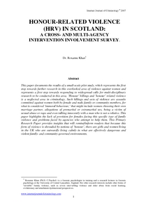 Khan, R orcid iconORCID: 0000-0002-3485-2450 (2007) Honour-related violence (HRV) in Scotland: A cross- and multi-agency intervention involvement survey. International Journal of Criminology . pp. 1-8.