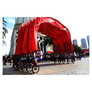 Designed by PAO on the theme of the city as a meeting place, the People’s Canopy is a two-storey high expandable roof structure on bicycle wheels. The ten units are designed to collapse to the size of a double decker bus to be pedalled from one location to another and thereby transform underused public spaces; spaces for auto transport are turned into spaces for pedestrians and events, and open streets connected.