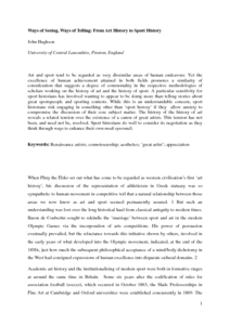 Art and sport tend to be regarded as very dissimilar areas of human endeavour. Yet, the excellence of human achievement attained in both fields promotes a similarity of consideration that suggests a degree of commonality in the respective methodologies of scholars working on the history of art and the history of sport. A particular sensitivity for sport historians has involved wanting to appear to be doing more than telling stories about great sportspeople and sporting contests. While this is an understandable concern, sport historians risk engaging in something other than ‘sport history’ if they allow anxiety to compromise the discussion of their core subject matter. The history of the history of art reveals a related tension over the existence of a canon of great artists. This tension has not been, and need not be, resolved. Sport historians do well to consider its negotiation as they think through ways to enhance their own modi operandi.