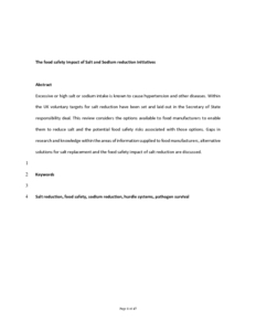 Excessive or high salt or sodium intake is known to cause hypertension and other diseases. Within the United Kingdom voluntary targets for salt reduction have been set and laid out in the Secretary of State responsibility deal. This review considers the options available to food manufacturers to enable them to reduce salt and the potential food safety risks associated with those options. Gaps in research and knowledge within the areas of information supplied to food manufacturers, alternative solutions for salt replacement and the food safety impact of salt reduction are discussed.