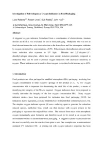 A triggered oxygen indicator, formulated from a combination of electrochrome, titanium dioxide and EDTA, was evaluated for use in modified atmosphere packaging. Methylene blue was not an ideal electrochrome due to its slow reduction to the leuco form and fast subsequent oxidation by oxygen present at low concentrations, >0.1%. Polyviologen electrochromes showed much faster reduction after exposure to UV light. Thionine and 2,2?-dicyano-1,1?-dimethylviologen dimesylate, which have more anodic reduction potentials compared to methylene blue, can be used to produce oxygen indicators with decreased sensitivity to oxygen. These indicators can be used to detect oxygen even when levels increase up to 4.0%.