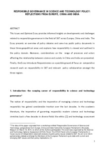 This Issues and Opinions Essay provides insights on developments and challenges related to responsible governance in the field of science and technology (S&T) across Europe, China and India. The Essay presents an overview of policy debates and some key public policy documents in these three geopolitical areas, exploring how responsibility is viewed and outlined in the policy domain. Considerations on the range of processes and actors affecting the relationship between science and society in China and India are also presented. Finally, the Essay introduces ‘responsiveness’ as a possible area for comparative research work on responsibility in S&T and relevant policy collaboration amongst the three regions.