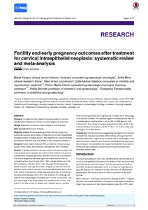 Kyrgiou, M., Mitra, A., Arbyn, M., Stasinou, S. M., Martin-Hirsch, P., Bennett, P. and Paraskevaidis, E. (2014) Fertility and early pregnancy outcomes after treatment for cervical intraepithelial neoplasia: systematic review and meta-analysis. BMJ, 349 (oct28). g6192-g6192. ISSN 1756-1833