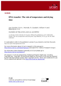 It has previously been shown, and reconfirmed here, that biological material on a substrate will transfer readily upon contact with another substrate when wet but hardly when dry. There is however a paucity of data regarding the speed at which body fluids dry and how this may affect its transfer upon contact. Here we conduct transfer experiments at 4 �C, 22 �C and 40 �C at multiple time points during the drying process. The speed at which blood dries is dependent on the temperature, with the drying process complete within 15–60 min. The percentage of deposited DNA transferred upon contact follows an exponential pattern of decline from soon after deposition, decreasing until the sample is dry. There are no differences in transfer rates upon contact among the different temperature conditions within the first 5 min or after 60 min since deposit, but significant variation occurs between these time points. When considering the likelihood of a proposed scenario that incorporates one or more contact situations it is important to consider the timing of the potential transfer event(s) relative to when the biological sample in question was initially deposited. The results of this study will assist the interpretation and evaluation of alternative scenarios involving transfer of biological substances.