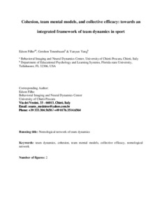 A nomological network on team dynamics in sports consisting of a multi-framework perspective is introduced and tested. The aim was to explore the interrelationship among cohesion, team mental models (TMM), collective-efficacy (CE), and perceived performance potential (PPP). Three hundred and forty college-aged soccer players representing 17 different teams (8 female and 9 male) participated in the study. They responded to surveys on team cohesion, TMM, CE and PPP. Results are congruent with the theoretical conceptualization of a parsimonious view of team dynamics in sports. Specifically, cohesion was found to be an exogenous variable predicting both TMM and CE beliefs. TMM and CE were correlated and predicted PPP, which in turn accounted for 59% of the variance of objective performance scores as measured by teams’ season record. From a theoretical standpoint, findings resulted in a parsimonious view of team dynamics, which may represent an initial step towards clarifying the epistemological roots and nomological network of various team-level properties. From an applied standpoint, results suggest that team expertise starts with the establishment of team cohesion. Following the establishment of cohesiveness, teammates are able to advance team-related schemas and a collective sense of confidence. Limitations and key directions for future research are outlined.