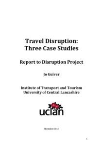 This report draws together the findings of three studies of travel disruption and its impacts on travellers: the volcanic ash cloud which disrupted aviation in Europe in 2010, the loss of road bridges between November 2009 and April 2010 at Workington, Cumbria and the severe winter weather across the UK in the winter of 2010-2011. It proposes a six phase cycle: normality, when transport provision matches expectations drawn from experience, tickets, timetables, etc;, disruption, when the transport provision fails to meet expectations; touching the new context when travellers seek to assess how the changed conditions affect their travel plans; the revised plan, when travellers make new plans on the basis of what they know about the context, the consequences, which includes counting the cost of changed travel plans in terms of extra expenditure of time, money, effort, prolonged absences as well as any benefits emanating from the experience; reflection and incorporation whereby the experience of disruption is assimilated int the new normality; this can include trust of agents, information, travelling more prepared for disruption or being aware of new channels of information or help.