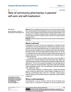 Rutter, Paul orcid iconORCID: 0000-0003-4106-1515 (2015) Role of community pharmacists in patients' self-care and self-medication. Integrated Pharmacy Research and Practice, 4 . pp. 57-65.