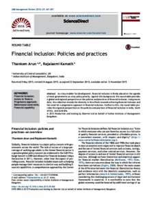 As a key enabler for development, financial inclusion is firmly placed on the agenda of most governments as a key policy priority. Against this background, this round table provides a global and regional perspective on the policies and practices of financial inclusion. Using macro data, the collection reveals the diversity in the efforts towards achieving financial inclusion and the need for a progressive approach in financial inclusion. Further to this, the round table provides the regional perspectives on the policies and practices of financial inclusion in India, South Africa, and Australia.