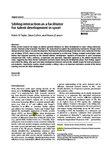 While current research has begun to address parental influences on talent development in sport, sibling interaction remains relatively under-examined. Therefore, this study aimed to explore the underpinning mechanisms through which sibling interaction impacts on talent development. Retrospective phenomenological interviews were conducted with four sets of siblings (N = 9), where at least one sibling had competed to an elite level. Findings revealed several higher-order themes that impacted positively on the talented athletes’ development: regularity of interaction in sport, emotional interpersonal skills, rivalry, resilience, co-operation and separation. Separation appeared as the athlete reached elite status, suggesting that these former mechanisms primarily impact during the development phase. Such findings support and extend the sibling, elite sport and talent development literature and provide valuable insight for both practitioners and academics. Importantly, coaches should consider a sibling’s role as an important mechanism outside of the formal coaching structure for talent development.