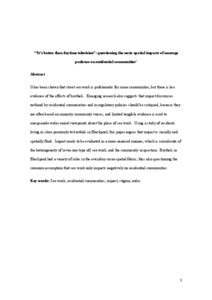 It has been shown that street sex work is problematic for some communities, but there is less evidence of the effects of brothels. Emerging research also suggests that impact discourses outlined by residential communities and in regulatory policies should be critiqued, because they are often based on minority community voices, and limited tangible evidence is used to masquerade wider moral viewpoints about the place of sex work. Using a study of residents living in close proximity to brothels in Blackpool, this paper argues that impact is socially and spatially fluid. Impact needs to be evaluated in a more nuanced manner, which is considerate of the heterogeneity of (even one type of) sex work, and the community in question. Brothels in Blackpool had a variety of roles in the everyday socio-spatial fabric; thus also questioning the common assumption that sex work only impacts negatively on residential communities.