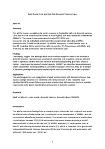 This article focuses on adult social work’s response in England to high-risk domestic violence cases and the role of adult social workers in Multi-Agency Risk and Assessment Conferences. (MARACs). The research was undertaken between 2013-2014 and