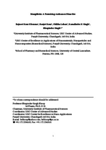 Of late, several biologically active antioxidants from natural products have been investigated by the researchers in order to combat the root cause of carcinogenesis, i.e., oxidative stress. Mangiferin, a therapeutically active C-glucosylated xanthone, is extracted from pulp, peel, seed, bark and leaf of Mangifera indica. These polyphenols of mangiferin exhibit antioxidant properties and tend to decrease the oxygen-free radicals, thereby reducing the DNA damage. Indeed, its capability to modulate several key inflammatory pathways undoubtedly helps in stalling the progression of carcinogenesis. The current review article emphasizes an updated account on the patents published on the chemopreventive action of Mangiferin, apoptosis induction made on various cancer cells, along with proposed antioxidative activities and patent mapping of other important therapeutic properties. Considering it as promising polyphenol, this paper would also summarize the diverse molecular targets of Mangiferin.