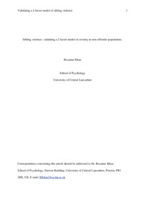Objective: Despite a recent surge of academic and clinical interest in sibling violence (SV), valid measures of severity have not been psychometrically established using non-offender populations. This study examined the factor-structure of intentional SV severity in a non-forensic sample considered to be not at ‘high-risk’ for violence, using the only existing empirically-driven model of severe SV committed with intent (Khan & Cooke, 2013). The prior model was established in a high-risk for violence, young offender sample (N=111; mean age=14.53) and revealed two underlying factors: ‘SV with weapon use’ and ‘SV without weapon use’. Method: This study examined data from an older, mixed community and student sample (N=899; mean=22.53) to test the factor structure and reliability of the existing severity model. Results: Participants reported a wide range of violent acts against their sibling(s) with aim of injuring them, including weapon use. Using exploratory factor analyses and confirmatory factor analyses, the prior 2-factor model was empirically supported using this non-correctional population. The new model comprised Factor 1 (potentially lethal SV) and Factor 2 (non-life threatening SV). Conclusion: The generalizability of the original 2-factor model, established using an offender sample, was demonstrated in this non-offender sample designated not at ‘high risk’ for violence.
