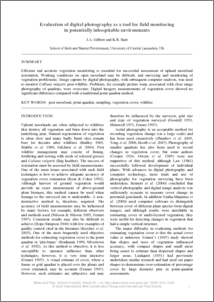 Efficient and accurate vegetation monitoring is essential for successful assessment of upland moorland restoration. Working conditions on open moorland may be difficult, and surveying and monitoring of vegetation problematic. Image capture by digital photography, with subsequent computer analysis, was used to monitor Calluna vulgaris post-wildfire. Problems, for example picture warp, associated with close range photography of quadrats, were overcome. Digital imagery measurements of vegetation cover showed no