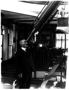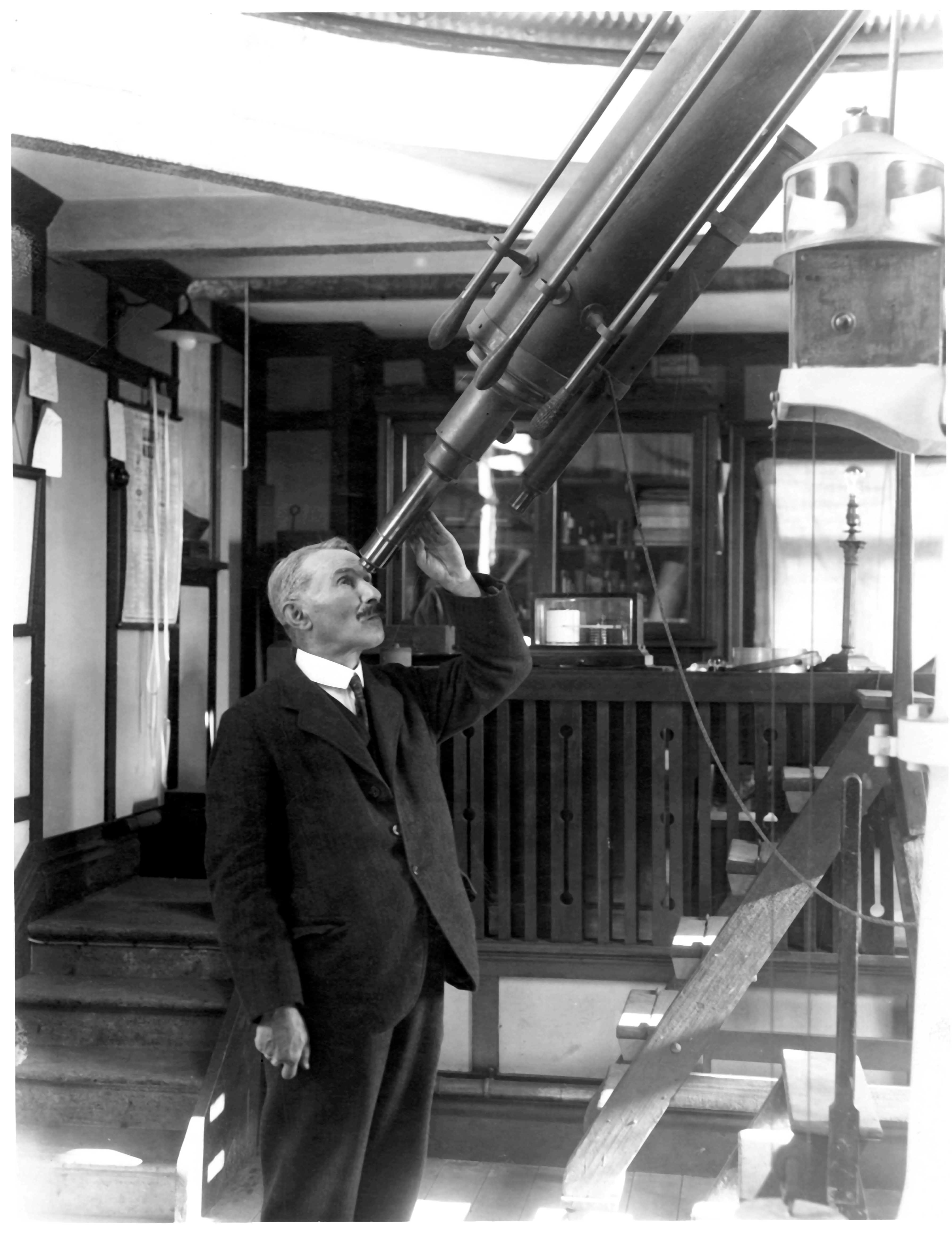 Gibbs, George James (1930) George J Gibbs with the Thomas Cooke 8 inch Refractor Telescope at Jeremiah horrocks Observatory, Moor Park, Preston. [Image] (Unpublished)