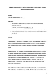 "The application of geochemical screening for tracking insects and other organisms is poorly understood. We explored multi-elemental profiles of an insect pest and its food from different locations in order to identify intrinsic markers of geographic origin. ICP-AES screening was completed for soil, maize grains and Prostephanus truncatus of different geographic origin, with insects collected in the field or reared on maize under controlled conditions. Background level geochemical data are presented with concentrations of Cu, S and Sr in maize, and Al, Ba, Ca, Fe, S, Si, Sr, Ti and Zn in insects differing according to their origin, or that of their food. Cu, Fe and Zn determinations of insects were 20, 6.5 and 11.5 times the concentrations of the maize they were reared on. A Linear Discriminant Analysis (LDA) based on Al, Fe, Sr and Zn successfully assigned 78% of laboratory-reared P. truncatus and 94% of field-caught insects to their origin (68% and 75% respectively after jacknifing). There was excellent discrimination between insects reared on maize from Guanajuato and Nuevo Léon, and Guanajuato and Michoacán, good separation between Sonora and Nuevo Léon but overlap for Sonora, Guanajuato and Michoacán, and Michoacán and Nuevo Léon. The same LDA for field-caught insects gave complete separation between Michoacán and Sonora, but some overlap between Michoacán and Nuevo Léon. This robust ICP-AES technique successfully identified a combination of elements able to classify insects according to their origin. The model was restricted to elements showing a normal distribution but non-parametric tests suggest other elements may act as intrinsic markers. This shows the potential of atomic spectroscopy for remotely tracing insects and other biological materials, with applications including providing provenance data for species routinely captured for surveillance and to track natural enemies and wildlife. "