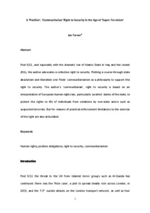 Post 9/11, and especially with the dramatic rise of Islamic State in Iraq and the Levant (ISIL), the author advocates a collective right to security. Plotting a course through state absolutism and liberalism one ‘finds’ communitarianism as a philosophy to support this right to security. The author’s ‘communitarian’, right to security is based on an interpretation of European human rights law, particularly ‘positive’ duties of the state, to protect the rights to life of individuals from violations by non-state actors such as suspected terrorists. But for reasons of practical enforcement limitations to the exercise of the right are also articulated.