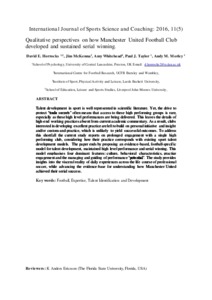 Horrocks, DE, McKenna, J, Whithead, A, Taylor, PJ orcid iconORCID: 0000-0002-9999-8397 and Morley, AM orcid iconORCID: 0000-0003-1942-1983 (2016) Qualitative perspectives on how Manchester United Football Club developed and sustained serial winning. International Journal of Sports Science & Coaching, 11 (4). pp. 467-477. ISSN 1747-9541