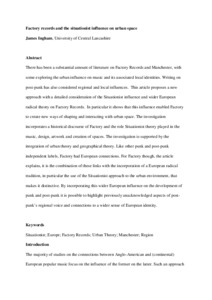 There has been a substantial amount of literature on Factory Records and Manchester, with some exploring the urban influence on music and its associated local identities. Writing on post-punk has also considered regional and local influences. This article proposes a new approach with a detailed consideration of the Situationist influence and wider European radical theory on Factory Records. In particular it shows that this influence enabled Factory to create new ways of shaping and interacting with urban space. The investigation incorporates a historical discourse of Factory and the role Situationist theory played in the music, design, artwork and creation of spaces. The investigation is supported by the integration of urban theory and geographical theory. Like other punk and post-punk independent labels, Factory had European connections. For Factory though, the article explains, it is the combination of these links with the incorporation of a European radical tradition, in particular the use of the Situationist approach to the urban environment, that makes it distinctive. By incorporating this wider European influence on the development of punk and post-punk it is possible to highlight previously unacknowledged aspects of post-punk’s regional voice and connections to a wider sense of European identity.
