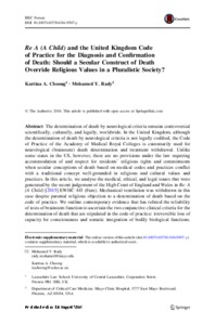 Choong, Kartina Aisha orcid iconORCID: 0000-0001-9407-1771 and Rady, Mohamed Y. (2016) Re A (A Child) and the United Kingdom Code of Practice for the Diagnosis and Confirmation of Death: Should a Secular Construct of Death Override Religious Values in a Pluralistic Society? HEC Forum, 30 . pp. 71-89. ISSN 0956-2737