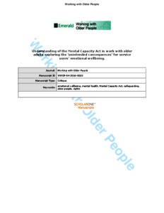 The purpose of this paper is to explore the consequences for older people’s mental wellbeing of understandings relating to the Mental Capacity Act 2005 (MCA). The MCA seeks to maximise people’s abilities to make decisions and provides a framework for decisions to be made in a person’s best interests should they lack the mental capacity to do so themselves (Graham and Cowley, 2015). Practice varies widely amongst health and social care practitioners and little is known about the nature of interventions under the MCA or the outcomes for service users’ lives and health, especially their mental health and emotional wellbeing.