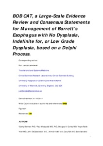 Bennett, Cathy, Moayyedi, Paul, Corley, Douglas A, DeCaestecker, John, Falck-Ytter, Yngve, Falk, Gary, Vakil, Nimish, Sanders, Scott, Vieth, Michael et al (2015) BOB CAT: a Large-Scale Review and Delphi Consensus for Management of Barrett’s Esophagus With No Dysplasia, Indefinite for, or Low-Grade Dysplasia. The American Journal of Gastroenterology, 110 (5). pp. 662-682. ISSN 0002-9270