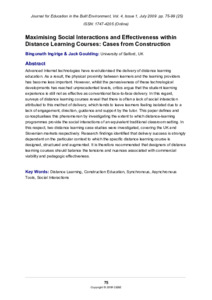Ingirige, Bingunath and Goulding, Jack Steven (2009) Maximising Social Interactions and Effectiveness within Distance Learning Courses: Cases from Construction. Journal for Education in the Built Environment, 4 (1). pp. 75-99. ISSN 1747-4205