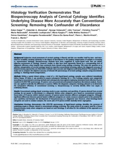 Gajjar, Ketan, Ahmadzai, Abdullah, Valasoulis, George, Trevisan, Julio, Founta, Christina, Nasioutziki, Maria, Loufopoulos, Aristotelis, Kyrgiou, Maria, Stasinou, Sofia Melina et al (2014) Histology Verification Demonstrates That Biospectroscopy Analysis of Cervical Cytology Identifies Underlying Disease More Accurately than Conventional Screening:Removing the Confounder of Discordance. PLoS ONE, 9 (1).