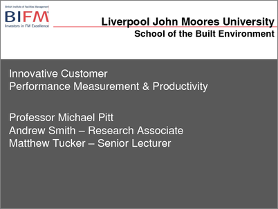 Smith, Andrew James, Pitt, Michael and Tucker, Matthew (2008) Innovative Customer Performance Measurement and Productivity. In: British Institute of Facilities Management (BIFM) Annual Conference, Keble College, Oxford.