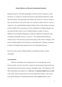 Despite the frequency with which relationships are dissolved and the consequences of this dissolution, few studies have considered the manner in which individual differences (rather than characteristics of the relationship itself) influence the selection of a break up strategy or break up related distress. The current studies were conducted to address this issue. In Study 1, women (N = 141) completed Machiavellianism (Christie & Geis, 1970) and break up strategy (Collins & Gillath, 2012) questionnaires. Women with high levels of Machiavellianism were more likely than those with low levels of Machiavellianism to employ Avoidance/Withdrawal, Cost Escalation, Manipulation, and Distant/Mediated Communication when terminating a relationship. In Study 2, women (N = 125) completed Machiavellianism (Christie & Geis, 1970) and break up distress (Field, Diego, Pelaez, Deeds, & Delgado, 2010) measures. Machiavellianism did not predict post relationship dissolution distress. Findings are discussed in relation to the Machiavellian interpersonal style and relationship preferences.
