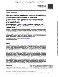 Gorrochategui, Eva, Li, Junyi, Fullwood, Nigel. J, Ying, Guang-Guo, Tian, Meiping, Cui, Li, Shen, Heqing, Lacorte, Silvia, Tauler, Roma et al (2016) Diet-sourced carbon-based nanoparticles induce lipid alterations in tissues of zebrafish (Danio rerio) with genomic hypermethylation changes in brain. Mutagenesis . ISSN 0267-8357