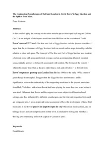 In this article I apply the concept of the urban soundscape as developed by Long and Collins (2012) in an analysis of the impact musicians from Hull had on the evolution of David Bowie’s seminal 1972 work The Rise and Fall of Ziggy Stardust and the Spiders from Mars. I argue that the performance of Ziggy Stardust, both on record and on stage, is doubly coded in relation to place and space. The 'concept' of The Rise and Fall of Ziggy Stardust as a musical, a fictional story with songs performed on stage, and an accompanying album of recorded songs, initially appears to be heavily associated with London. The format of the concept – which the creator described as theatre, rather than a rock and roll show – is derived from Bowie’s experience growing up in London from the late 1940s to the early 1970s, a time of great change in the capital. I suggest that the Ziggy Stardust performance, and its significance, rests on the authenticity of the supporting musicians in the project, musicians from Hull, Yorkshire, with whom Bowie had been playing for more than two years before it was aired. I illustrate that Bowie and his support cast were subject to different cultural settings, and thus influenced by different soundscapes, and the relevant properties from each are compared here. I go on to provide some assessment of how the involvement of these Hull musicians in the Bowie project has impacted upon the city’s historical music culture, and on heritage issues and cultural production in that town. I conclude by noting that Hull has a thriving arts community and is UK Capital of Culture in 2017.