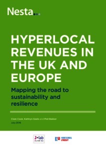During the past few years, Nesta and other strategic organisations have published research and delivered a range of resources to directly support hyperlocal media publishers to innovate their service. While there are a growing number of examples of innovative and dynamic practice, and an increasing relevance of hyperlocal media due to the shrinking footprint of traditional local print and broadcast media, our research highlights key challenges concerning sustainability (financial as well as human resource), growth and ‘findability’. As the sector continues to grow and becomes more diverse - in regards to the types of businesses and services that are producing content, the type of content being produced, the means through which content is being distributed and the ways in which local audiences are accessing and engaging with content - a more robust examination of how publishers are monetising their services is necessary. Therefore, this study undertakes an analysis of current and emerging revenue streams and the digital technologies facilitating these – the findings of which will help publishers implement positive changes to their own service. This research is aimed at online-first (but not necessarily online-exclusive) hyperlocal practitioners in the UK and in Europe, for them to use the findings and guidance to improve their ability to provide news and information to their local communities for the long term. It also provides evidence and recommendations to wider industry and policymakers in Europe in order for them to better support hyperlocal media, in regards to aspects such as the Digital Single Market, tax regulation especially in regards to organisational structure, and regulation of other areas of the digital and media sectors.