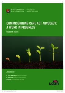 Local Authorities in England are required under the Care Act 2014 to make independent advocacy available to eligible service users and carers. In October 2014, the Social Care Institute for Excellence (SCIE) launched guidance to support good practice in commissioning independent advocacy. Early studies examining implementation of the Act highlighted lower than expected referrals for independent advocacy support and that many of those potentially eligible for advocacy under the Care Act might not be receiving it. In 2016, the Universities of Birmingham and Central Lancashire were commissioned by SCIE to undertake a rapid appraisal of how advocacy is being commissioned under the Care Act, and to identify the features of promising practice. This involved surveys of and interviews with commissioners and providers; documentary analysis; and a roundtable discussion involving people with experience of using social care services and other stakeholders to identify improvements in the commissioning process.