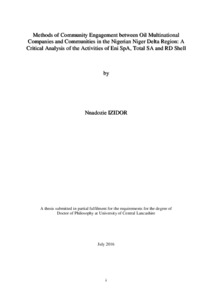 Izidor, Nnadozie (2016) Methods of Community Engagement between Oil Multinational Companies and Communities in the Nigerian Niger Delta Region: A Critical Analysis of the Activities of Eni SpA, Total SA and RD Shell. Doctoral thesis, University of Central Lancashire.