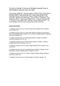 Brick, Thomas, Agbeko, Rachel S, Davies, Patrick, Davis, Peter J, Deep, Akash, Fortune, Peter-Marc, Inwald, David P, Jones, Amy, Levin, Richard et al (2017) Too Hot to Handle: A Survey of Attitudes towards Fever of 462 Pediatric Intensive Care Unit staff. European Journal of Pediatrics, 176 (3). pp. 423-427. ISSN 0340-6199