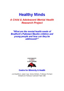 Bashford, Jonathan, Kaur, Jasbir, Winters, Moira, Williams, Richard and Patel, Kamlesh Kumar (2002) Healthy Minds: A child and adolescent mental health research project: What are the mental health needs of Bradford's Pakistani Muslim children and young people and how can they be addressed? Project Report. University of Central Lancashire (UCLan), Preston, Lancashire.