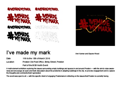 A multi-element exhibition exploring the issues surrounding empty buildings and spaces in and around Preston — with the aim to raise awareness and encourage an open and frank discussion about the problems in adapting buildings in the city, to provoke engagement and to capture the thoughts and comments that it generated.