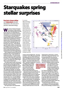 Don Kurtz, Simon Jeffrey and Conny Aerts describe discoveries in the new era of precision asteroseismology. We call it the “Tychonic Principle”: a revolutionary improvement in observational precision inevitably leads to discovery. For Tycho Brahe, the improvement was in precision of astromet- ric position; for us, over the decades since we were students, it has been orders of magnitude improvement in the precision of radial velocity and photometric measure- ments for stars. Three decades ago, stellar radial velocities were measured to 1 kms–1 precision; now, in the best cases they are measured to 10s of cms–1. Three decades ago, stellar light variability was measured to mmag precision (one part per thousand); now in the best cases it is measured to better than µmag precision (one part per million). Stellar astrophysics is being revo- lutionized by this new ultra-high precision.