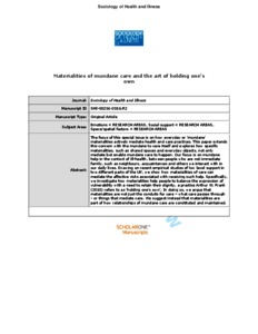 The focus of this special issue is on how everyday or 'mundane' materialities actively mediate health and care practices. This paper extends this concern with the mundane to care itself and explores how specific materialities, such as shared spaces and everyday objects, not only mediate but enable mundane care to happen. Our focus is on mundane help in the context of ill-health, between people who are not immediate family, such as neighbours, acquaintances and others we interact with in our daily lives. Drawing on recent empirical studies of low level support in two different parts of the UK, we show how materialities of care can mediate the affective risks associated with receiving such help. Specifically, we investigate how materialities help people to balance the expression of vulnerability with a need to retain their dignity, a practice Arthur W. Frank (2010) refers to as 'holding one's own'. In doing so, we argue that materialities are not just the conduits for care – what care passes through- or things that mediate care. We suggest instead that materialities are part of how relationships of mundane care are constituted and maintained.