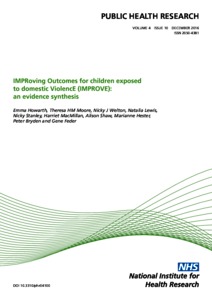 Howarth, Emma, Moore, Theresa HM, Welton, Nicky J, Lewis, Natalia, Stanley, Nicky orcid iconORCID: 0000-0002-7644-1625, MacMillan, Harriet, Shaw, Alison, Hester, Marianne, Bryden, Peter et al (2016) IMPRoving Outcomes for children exposed to domestic ViolencE (IMPROVE): an evidence synthesis. Public Health Research, 4 (10). pp. 1-342. ISSN 2050-4381