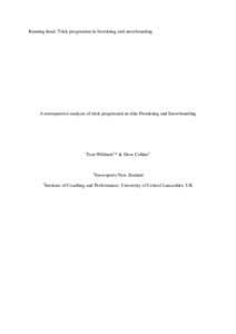This study offered a first examination of skill development within freeskiing and snowboarding, using semistructured interviews to examine trick progression. Participants were purposefully recruited as performing at world top 8 level in 2014, the most recent Winter Olympic Games. A semi structured interview protocol, using a personalized progress chart, enabled the examination of trick progression across disciplines, with at least one participant from each of the events represented at the Games. Trick progression was achieved intermittently, moving through different stages during the year subject to experiencing the right conditions, training facilities, balancing time for progression with time for consolidation, competition periods and rehabilitating from injuries. There was high variance in the duration of trick progression between individuals and also high variance in the number of repetitions required to land a trick in competition. Imagery was a mental skill widely used and universally supported by our sample. Athletes and coaches should take directionality into consideration when planning their progression, ensuring all four directions are included and that prerequisite manoeuvres are included in an athlete’s training repertoire at the right stage to facilitate the learning of more complex manoeuvres at a later stage of development. Our data found a 60–40 balance between time-spent training on and off-snow, further research is required to determine the best combination of traditional strength and conditioning versus movement conditioning approaches, both from an injury prevention and a performance enhancement perspective.
