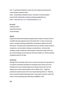 Ridley, Neesha (2016) An audit and trial aiming to reduce the rate of surgical site infections for women having a caesarean section. British Journal of Midwifery, 24 (3). pp. 170-171. ISSN 0969-4900