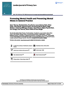 Thomas, Steve, Jenkins, Rachel, Burch, Tony, Calamos Nasir, Laura, Fisher, Brian, Giotaki, Gina, Gnani, Shamini, Hertel, Lise, Marks, Marina et al (2016) Promoting Mental Health and Preventing Mental Illness in General Practice. London Journal of Primary Care, 8 (1). pp. 3-9. ISSN 1757-1472
