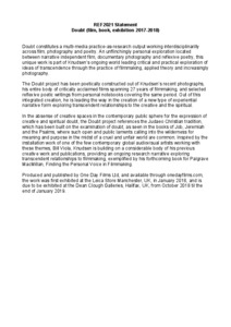 "I discovered that the history of philosophical and mystical thought is riddled with expressions of doubt. In the Judaeo Christian tradition, of course, the Bible is full of examples of expressions of doubt, from Job to Jeremiah to the Psalms. Such laments calling into the wilderness for signs and proof of God, for meaning and purpose in the midst of a cruel and unfair world are common in such laments, poetry and songs, but there are very few examples of audio visual works being used in this way. Doubt has been inspired by these laments; in particular Psalm 22 from the Bible, which has helped provide a tradition and structural bedrock from which to explore."
